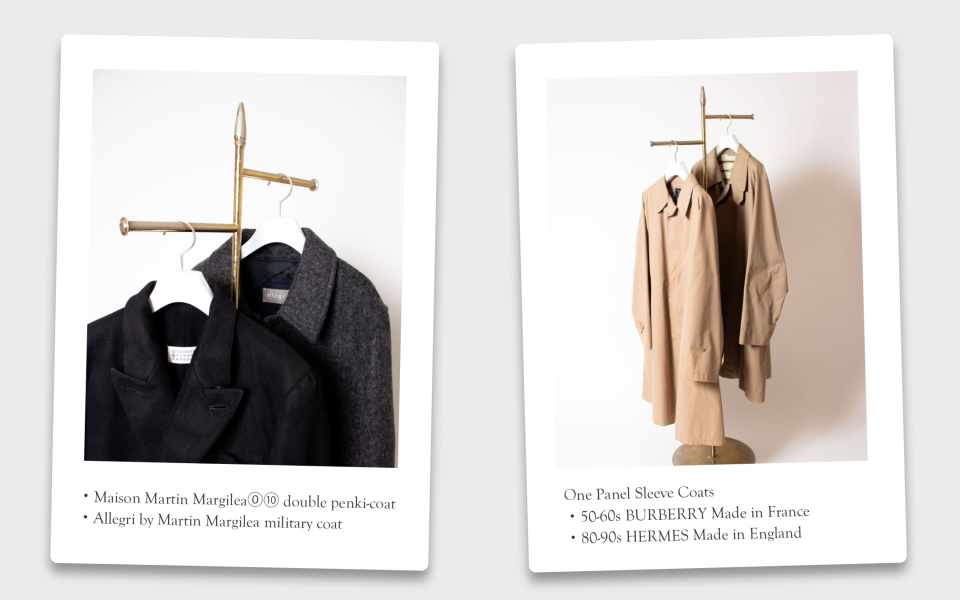 そこで今回はマルタン・マルジェラのアイテムに加え、マルジェラが”Allegri”にて手掛けたアイテム、各国のヴィンテージアイテムを讃えたアイテムも提案することで、マルジェラのみならず衣服への造詣がより深まる機会を提供いたします。